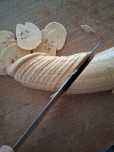 - Slice the green plantains thinly using a knife. To ensure that each chips cooks evenly make sure is slice is the same thickness as best as you can. Do not stress this part, simply fry the thicker ones longer in the oil.