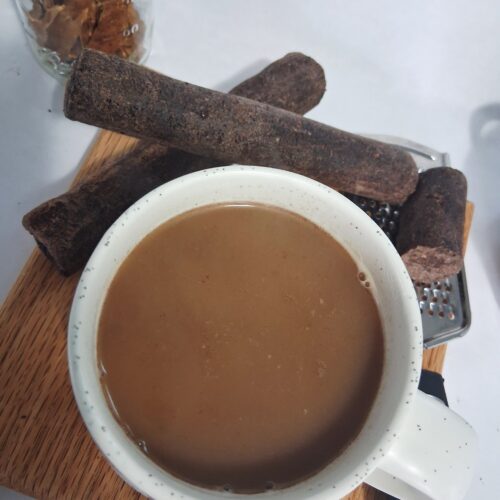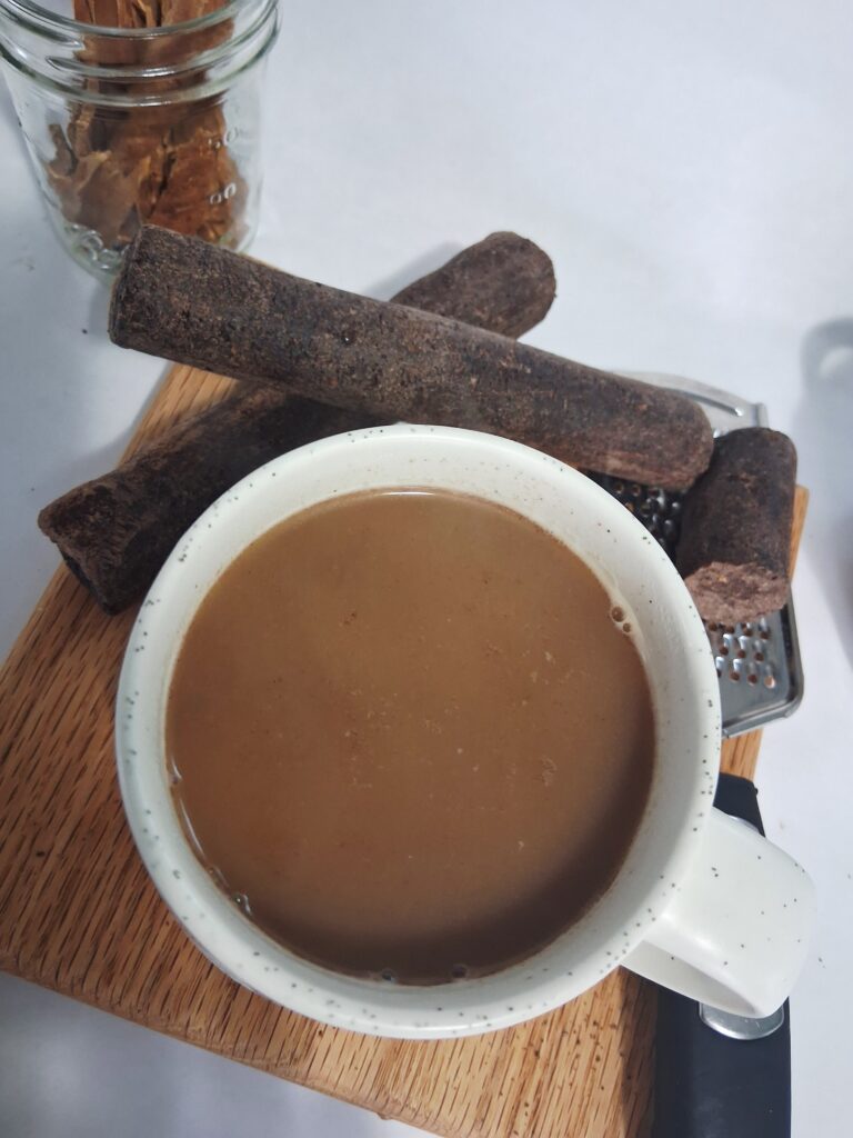 • Pour the blended milk into your cocoa tea. Stir and leave on heat until your milk is warm. Make sure your cone of panela is fully melted. Finish with a light dusting of grated nutmeg.